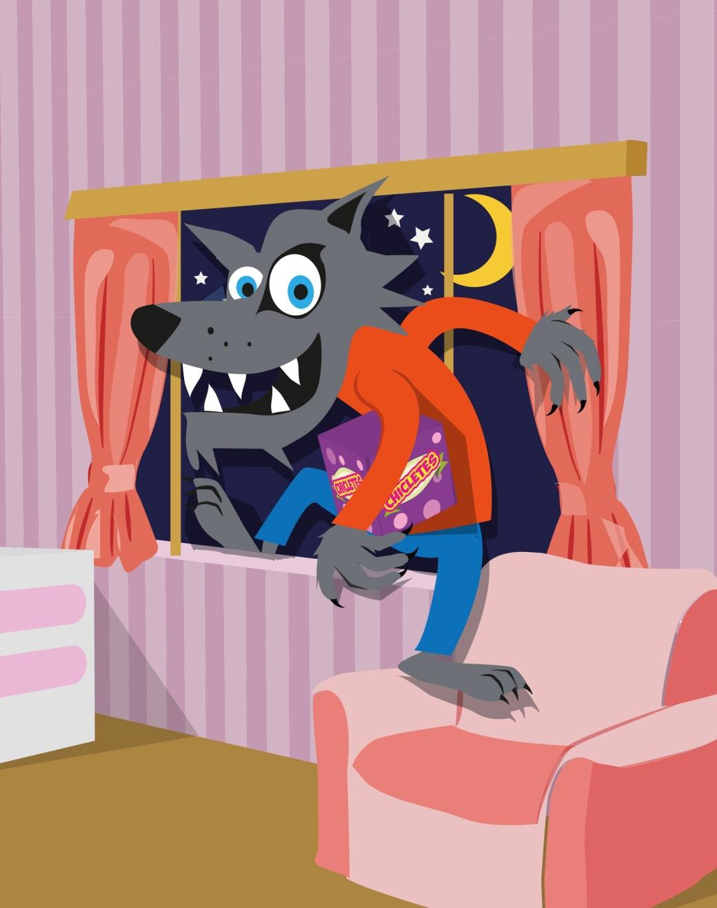 Naquela noite, o Lobo, com seu grande focinho, logo sentiu no ar, um incrível perfume de chicletes, que saia pela janela aberta do quarto da Lucila e foi correndo para lá.