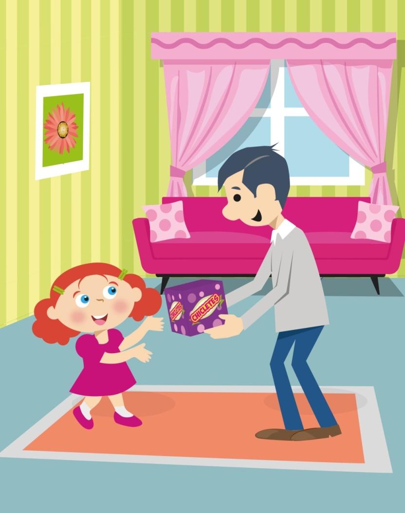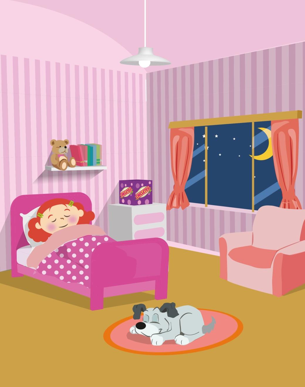 Muito feliz com seu presente, a menina colocou a caixinha de chicletes, em cima de um pequeno armário em seu quarto e foi se deitar; não sem antes, ganhar um beijinho de boa noite, de sua mamãe.